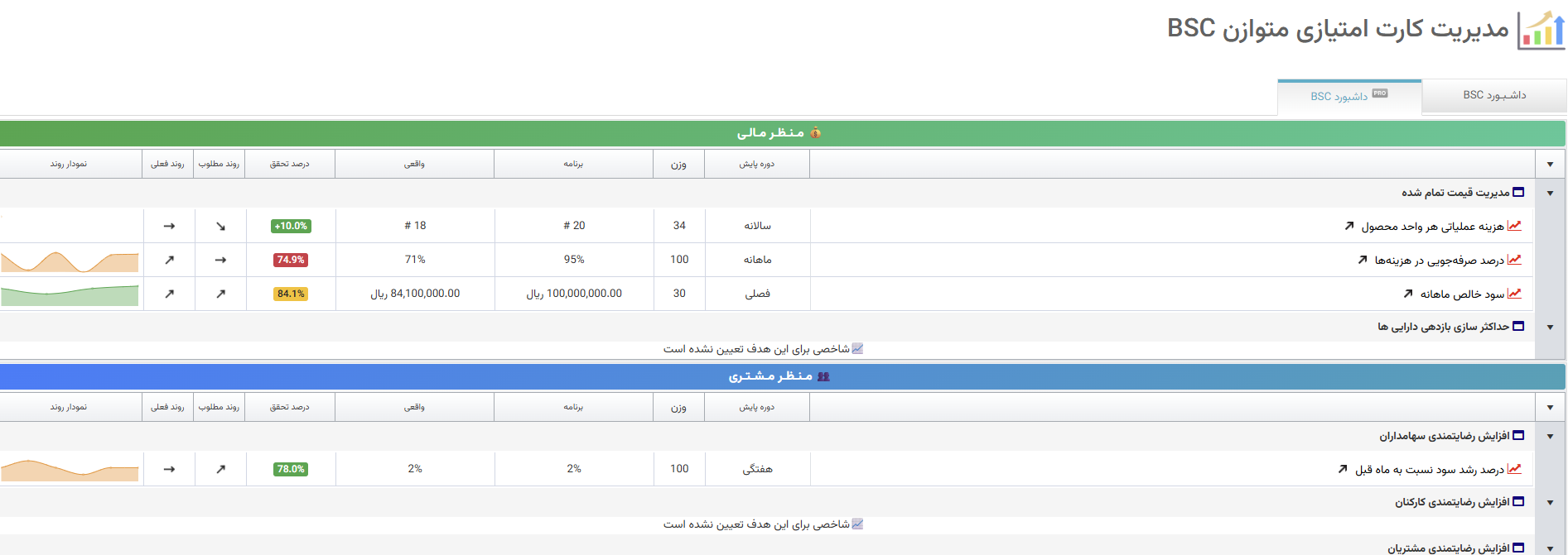 زیرسیستم مدیریت عملکرد سازمانی (BSC): با رویکرد کارت امتیازی متوازن (BSC)، امکان تعریف شاخصهای کلیدی (KPIs)، پایش عملکرد و ایجاد دشبوردهای مدیریتی را فراهم میسازد.
